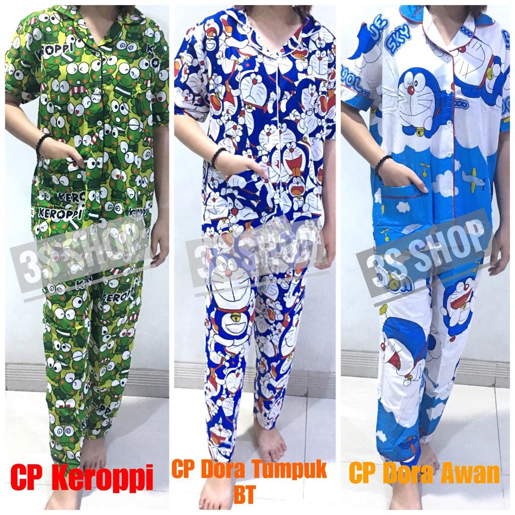 Baju Tidur Piyama Dewasa Cp Lengan Pendek Katun Doraemon Keroppi