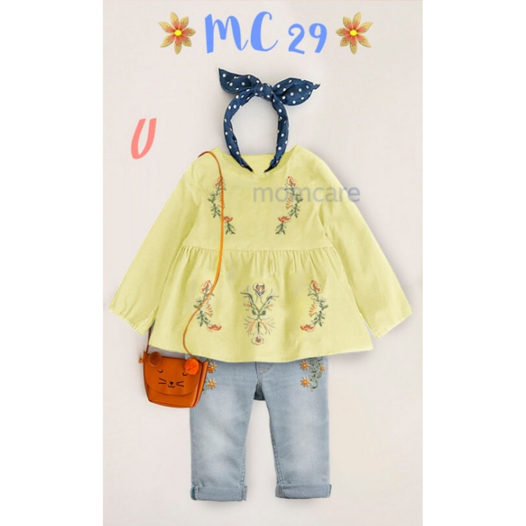Busana Muslim Anak Perempuan Warna Kuning Celana Jeans Motif Bunga
