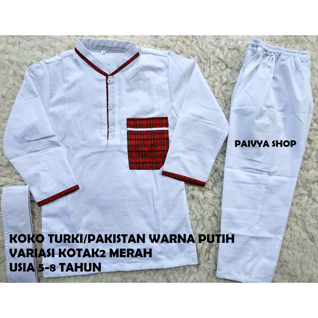 Baju Koko Anak Turki Pakistan Warna Putih Variasi Kotak2 Merah