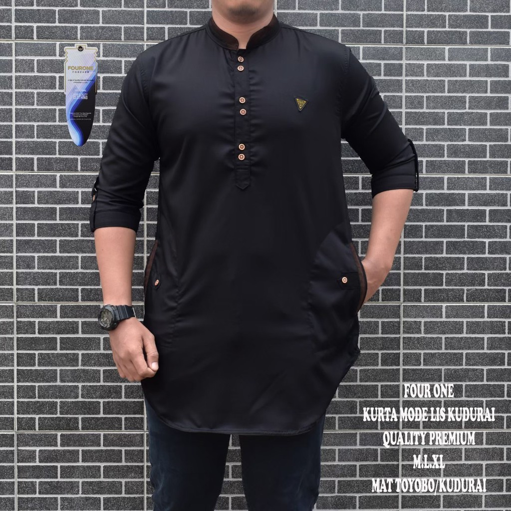 Baju Koko Gamis Pria Muslim Kurta Pakistan Hitam Kombinasi Mustard