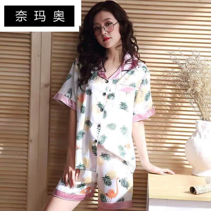 Gaya Stelan Hotpant Piyama Baju Tidur Satin Import Motif Daun