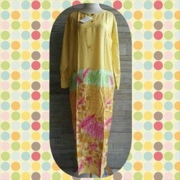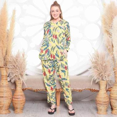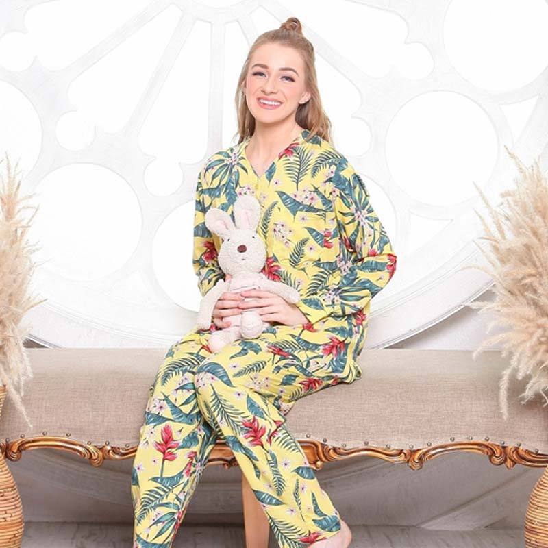 Jual Aukana Motif Daun Premium Long Sleeve Piyama Wanita Kuning