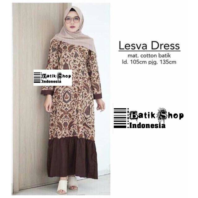 Gamis Lesva Dress Batik Sogan Casual Baju Muslim Kerja Kantoran