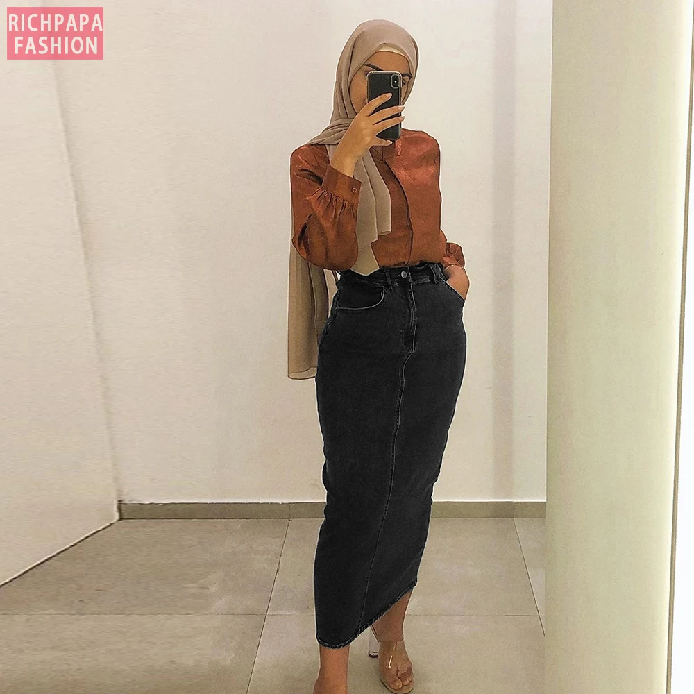 Denim Abaya Dubai Muslim Women Long Skirt Dress Turkish Islamic