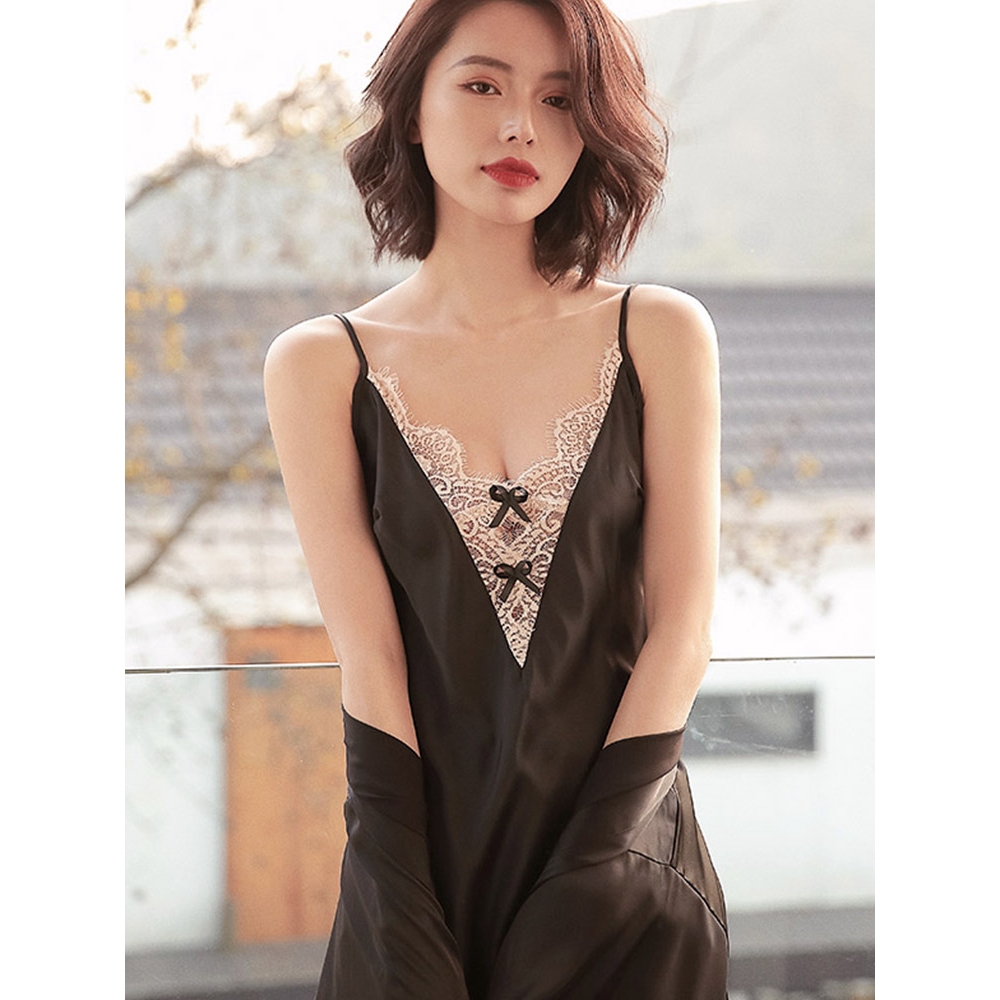 Dress Piyama Sling V Neck Tali Spaghetti Bahan Ice Silk Tipis