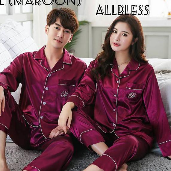 Adastock Couple Piyama Pijamas Lengan Panjang Satin Silk Baju