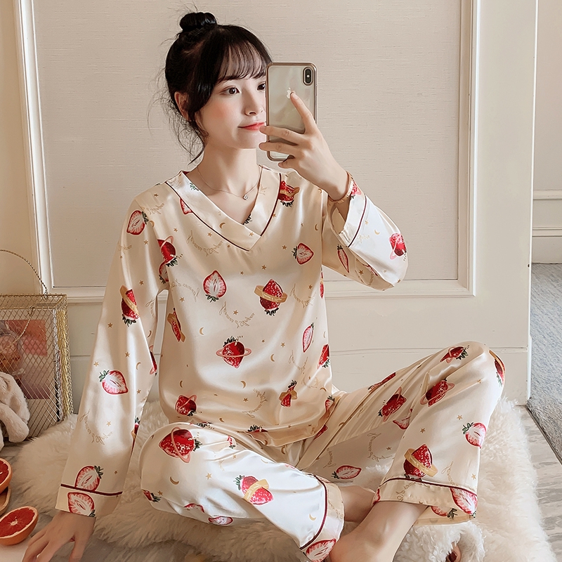 Baju Tidur Lengan Panjang Wanita Elegan V Neck Print Piyama Set 2